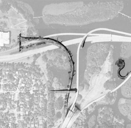 Many times, sitting in traffic on SR520, I have considered this debris with curiosity, wondering what can be done with them. They are waiting for a resolution that gives them dignity and brings them into the fold of the city. The Arboretum Master Plan suggests reusing them as a ‘multi-use link’ (including bicycles and service vehicles) to the present Museum of History and Industry (MOHI). I believe, instead, they should become a protagonist in the overall design of the city rather than a diminutive version of the original intent. I propose they be transformed into a linear park where one loses oneself in the linear labyrinth of Borges, a potential green connection between MOHI and the Arboretum, along paths and hills, conservatories and creeks. The whimsical effect of a park passing over the highway with dynamic vistas, overlaying vegetation on concrete super-imposed on the original riparian groves of phragmites and salix, offering alternative approaches to the water with ramps and small docks, would be enchantingly subversive. The linear character of such a park reinterprets, in an inside-out way, the original intention of the ramps. Symbolically, its linear quality forces the user along an axis that cannot be abandoned, follow to the end or return in your tracks. Similar to the use of the car ramps, it is parallel with the original postulate.