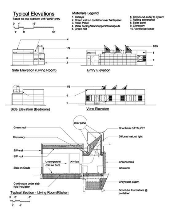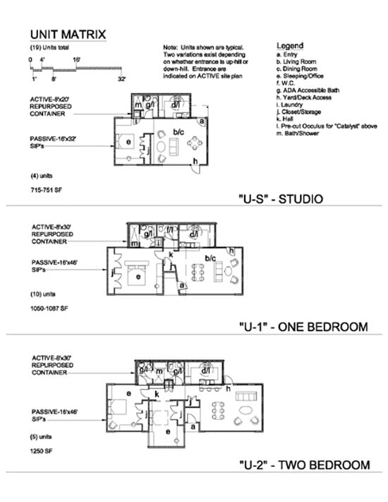 Our response: Create a car free active site, preserving as much native quality as possible. One site was along a busy road adjacent to an Audobon bird preserve. The other was a steep hillside wedged between two cul de sacs. We designated the site adjacent to the busy road as the “passive” site with tracking solar arrays. On the more private site we developed a “high rise garden” accessed by a tram with stops at terraces like the “floors” of an apartment building. The units were grouped along these terraces each with their own garden and all facing a public vegetated plaza. Residents park at the bottom and either walk or take the tram up the hill to their units. We designed three unit types: a studio, one and two bedroom. All units have a “service” component composed of a shipping container re-purposed to house bathrooms, kitchen and laundry. This is set on site with a crane. The “passive” space is composed of SIP’s that are delivered to site flat and lifted into place. We developed the “catalyst” which is a circular integrated solar array and ventilation system which can be placed on the roof and oriented as needed.
