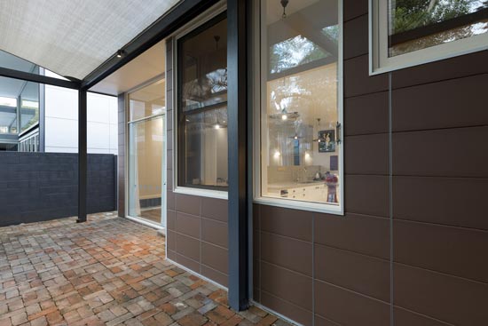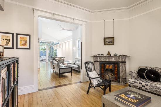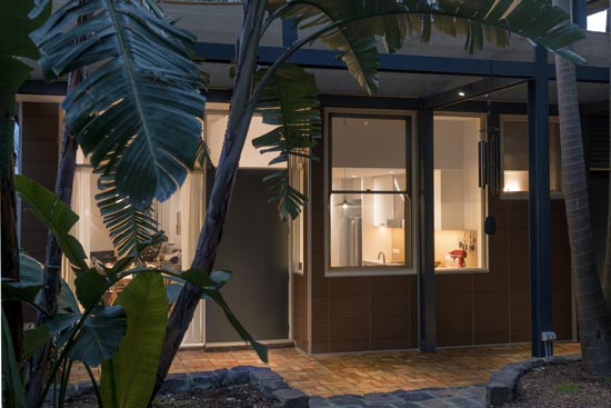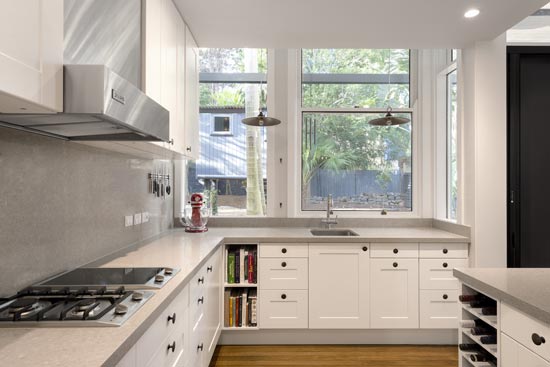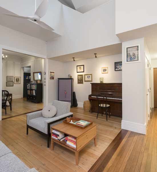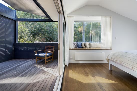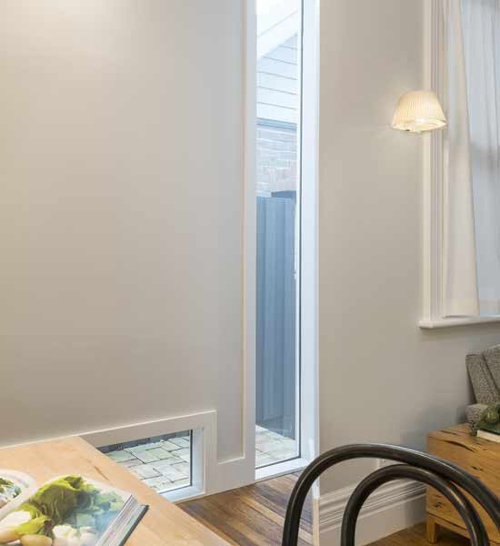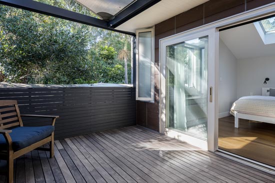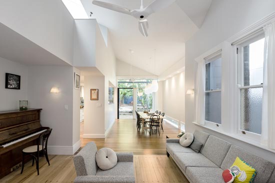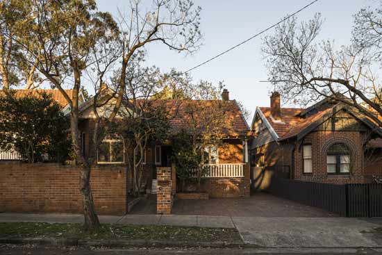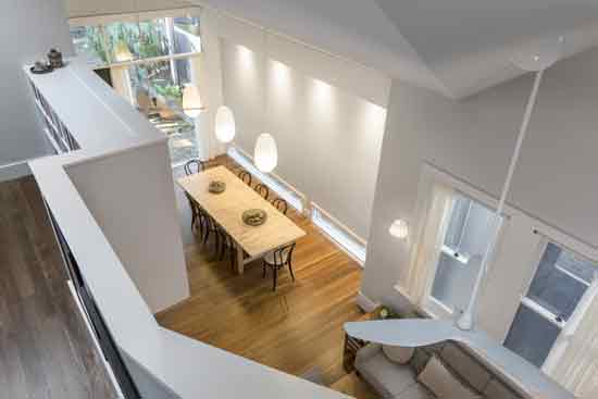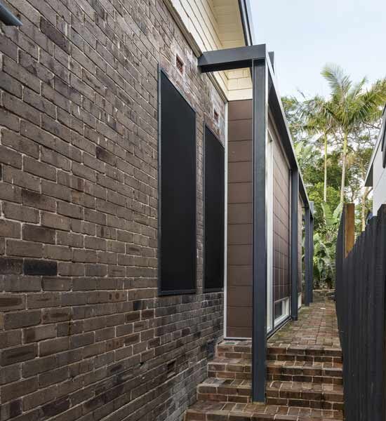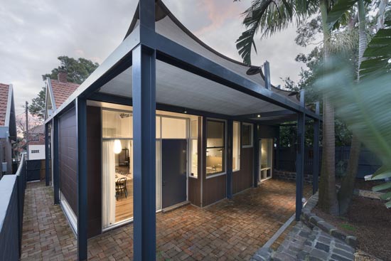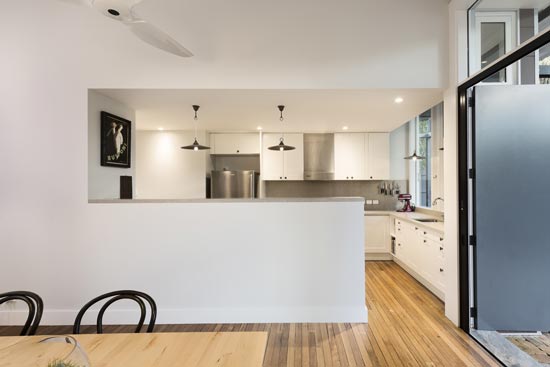 The client’s “forever house”, Kiora is a contraction of the Maori greeting “Kia Ora” meaning “be healthy and well.” The building is one house in a line of identical historically significant brick bungalows built at the beginning of the last century in North Sydney. All work to the original building was strictly limited by the local Council. The client said “I want to come into this house through time to today. Like Alice into the rabbit hole.” It needed to be contemporary, but also flow into the historic. The house is very compact with a lot of different rooms and at the same time feels spacious. The neighbors’ homes are a meter away and so it was important to bring light in and preserve the privacy of both. The new floors are of reclaimed “black butt” indigenous to Australia. The roof discretely sports solar pv panels and evacuated tube hot water heater which offsets the energy usage of the house by over 80%.