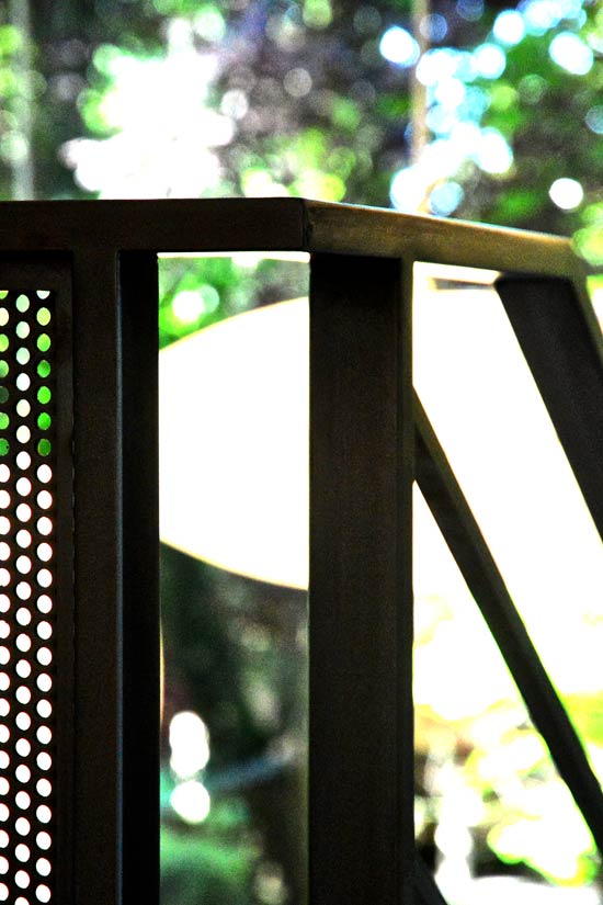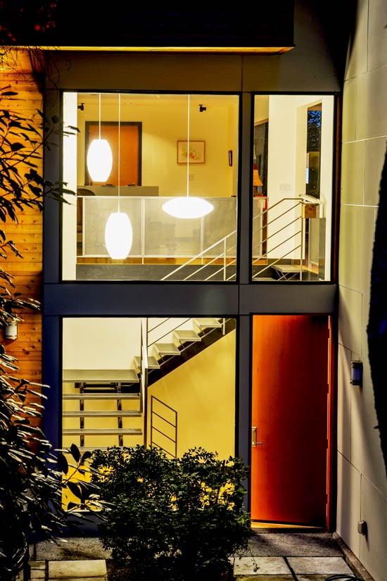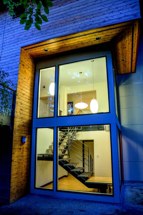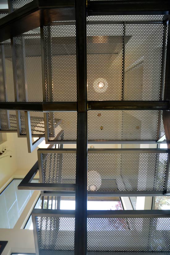 Functionally, the formal staircase would lead to the upstairs bedrooms as well as provide an indoor/outdoor connection to the back garden. In terms of design, the final choice was a steel staircase with a brushed finish and perforated metal treads and railing. The staircase wraps the interior wall, leaving a large central space. On two sides of the staircase, floor-to-ceiling windows provide a view to the richly vegetated back yard.