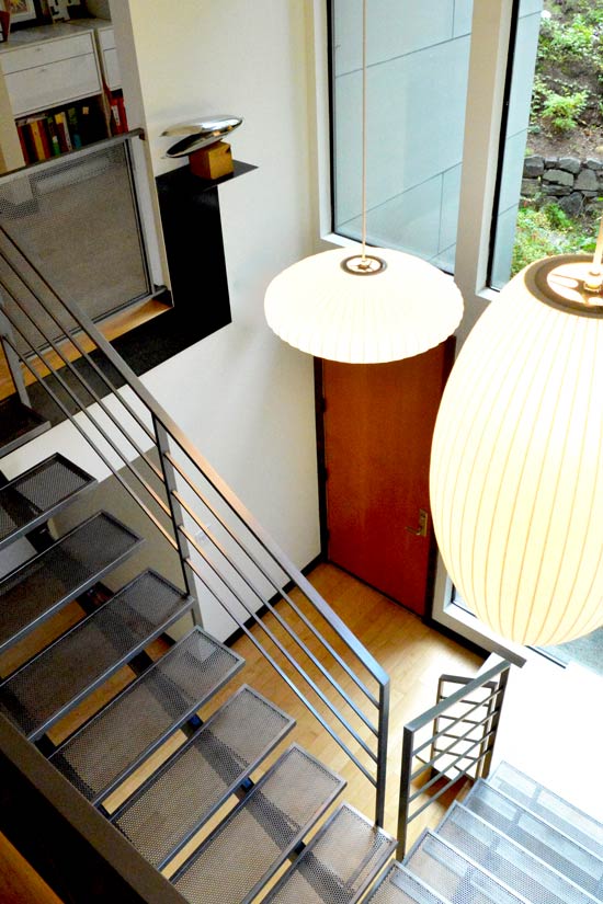 Modern lanterns (originally designed by George Nelson) complement the space as do elements designed to display artwork.